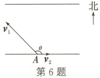 6. 长江某段南北两岸平行,如图,江面宽度$d = 1\ km$. 一艘游船从南岸码头点$A$处出发航行到北岸. 已知游船在静水中的航行速度$\boldsymbol{v}_{1}$的大小为$|\boldsymbol{v}_{1}| = 20\ km/h$,水流速度$\boldsymbol{v}_{2}$的大小为$|\boldsymbol{v}_{2}| = 5\ km/h$. 设$\boldsymbol{v}_{1}$和$\boldsymbol{v}_{2}$的夹角为$\theta$($0^{\circ} \lt \theta \lt 180^{\circ}$),则当游船的航行距离最短时,下列结论正确的是(