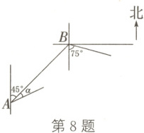 8. 如图,甲、乙两人做游戏,甲在A处发现乙在北偏东$45^{\circ}$方向,相距600m的B处,乙正以500m/min的速度沿南偏东$75^{\circ}$方向前进,甲立即以700m/min的速度沿北偏东($45^{\circ}+\alpha$)方向追赶乙,则甲追赶上乙最少需要