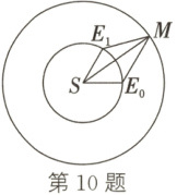 10. 早期天文学家常采用“三角法”测量行星的轨道半径.假设一种理想状态:地球E和某小行星M绕太阳S在同一平面上的运动轨道均为圆,三个星体的位置如图所示.当地球在$E_{0}$处时,测得$\angle SE_{0}M=\frac{2\pi}{3}$;行星M绕太阳S运动一周回到原来位置,地球运动到了$E_{1}$处,测得$\angle SE_{1}M=\frac{3\pi}{4}$,$\angle E_{1}SE_{0}=\frac{\pi}{3}$.若地球的轨道半径为R,则下列选项中与行星M的轨道半径最接近的是(参考数据:$\sqrt{3}\approx1.73$)(