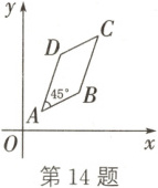 14. 在复平面内,$O$为原点,向量$\overrightarrow{OM} = (a,b)$,对应的复数为$a + bi(a,b \in \mathbf{R})$,将$\overrightarrow{OM}$绕点$O$按逆时针方向旋转$\frac{\pi}{4}$,且将向量$\overrightarrow{OM}$的模变为原来的$\sqrt{2}$倍,得向量$\overrightarrow{ON}$,此时向量$\overrightarrow{ON}$对应的复数为$(a + bi)(1 + i) = a - b + (a + b)i$. 如图,现有一个$□ ABCD$,点$A,B$的坐标分别为$(1,1)$,$(3,2)$,$|AD| = \sqrt{2}|AB|$,$\angle BAD = 45^{\circ}$,则点$D$的坐标为