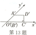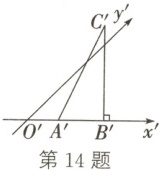 14.解:如图,过点C′作C′D′//y′轴,交x′轴于点D′,则∠C′D′B′ = 45°.因为B′C′与x′轴垂直,且B′C′ = 3,所以在Rt△C′B′D′中,易得C′D′ = 3$\sqrt{2}$.根据斜二测画法可知,△ABC的边AB上的高为2C′D′ = 6$\sqrt{2}$.