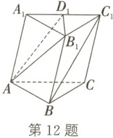 12. 解:当$\frac{A_1D_1}{D_1C_1}$=1时,BC₁//平面AB₁D₁. 理由:如图,连接A₁B交AB₁于点O,连接OD₁. 由斜三棱柱ABC - A₁B₁C₁可知,四边形A₁ABB₁为平行四边形,所以O为A₁B的中点. 因为$\frac{A_1D_1}{D_1C_1}$=1,即D₁为A₁C₁的中点,所以OD₁//BC₁. 又因为OD₁⊂平面AB₁D₁,BC₁⊄平面AB₁D₁,所以BC₁//平面AB₁D₁. 所以当$\frac{A_1D_1}{D_1C_1}$=1时,BC₁//平面AB₁D₁.