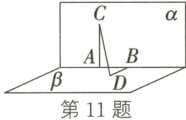 11. 如图,在直二面角 $ \alpha - AB - \beta $ 中,$ AC $ 和 $ BD $ 分别在平面 $ \alpha $ 和 $ \beta $ 内,它们都垂直于 $ AB $,且 $ AB = 4 $,$ AC = 6 $,$ BD = 8 $,则 $ CD = $