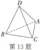 13. 如图,$ A $,$ B $,$ C $,$ D $ 为空间四点,在 $ \triangle ABC $ 中,$ AB = 2 $,$ AC = BC = \sqrt{2} $,等边三角形 $ ADB $ 以 $ AB $ 为轴运动,当平面 $ ADB \perp $ 平面 $ ABC $ 时,$ CD = $
