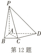 12. (2025·广东深圳期中)如图,在四棱锥 $ P - ABCD $ 中,底面 $ ABCD $ 是直角梯形,$ AD // BC $,$ AB \perp BC $,$ AB = BC = 1 $,$ AD = 2 $,$ PA \perp $ 平面 $ ABCD $,$ PA = 2 $。