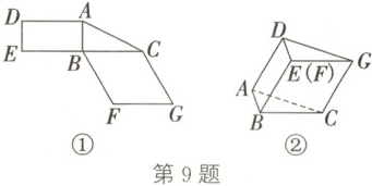 9. 如图①所示为由矩形$ADEB$,$Rt\triangle ABC$和菱形$BFGC$组成的一个平面图形,其中$AB=1$,$BE=BF=2$,$\angle FBC=60^{\circ}$.如图②,将其沿$AB$,$BC$折起,使得$BE$与$BF$重合,连接$DG$.