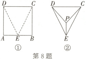 8. 如图①,四边形$ABCD$是正方形,$E$是$AB$的中点,若将$\triangle DAE$和$\triangle CBE$分别沿虚线$DE$和$CE$折起,使$AE$与$BE$重合,记$A$与$B$重合的点为$P$(如图②),则平面$PCD$与平面$ECD$所成的二面角为