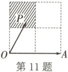 11. 如图,在$2× 2$的网格图中,每个小正方形的边长均为$1$,$P$是阴影区域内的一个动点(包括边界),$O$,$A$两点在格点(网格线的交点)上,则$|\overrightarrow {OP}-\overrightarrow {OA}|$的最小值为