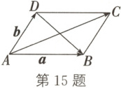 15. 核心素养 直观想象 如图,在$□ ABCD$中,$\overrightarrow {AB}=\boldsymbol{a}$,$\overrightarrow {AD}=\boldsymbol{b}$,先用$\boldsymbol{a}$,$\boldsymbol{b}$表示向量$\overrightarrow {AC}$和$\overrightarrow {DB}$,并回答:当$\boldsymbol{a}$,$\boldsymbol{b}$分别满足什么条件时,$□ ABCD$为矩形、菱形、正方形?