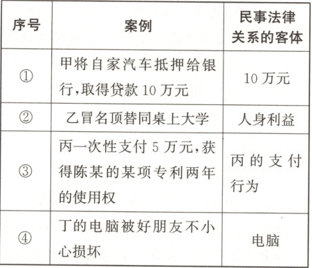 12.B 解析:民事法律关系的客体是民事权利和义务所指向的对象。甲将自家汽车抵押给银行,取得贷款10万元,这体现了债权关系,客体是行为,不是物,①排除;丙一次性支付5万元,获得陈某的某项专利两年的使用权,知识产权关系的客体是智力成果和商业标记,不是支付行为,③排除。
