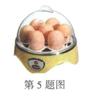 5.B 【解析】(本题考查比热容、内能和热机以及能量转化的知识)将风车放在蒸蛋器的上方,蒸汽对风车做功,将蒸汽的内能转化为风车的机械能,使风车转动起来,A正确,不符合题意;蒸汽烫手是因为它的温度高,B错误,符合题意;比热容是物质本身的一种特性,与物质的种类和状态有关,水的温度升高后其状态不变,比热容不变,C正确,不符合题意;热机的做功冲程将燃气的内能转化为活塞的机械能,所以蒸汽使纸风车转动与热机做功冲程的能量转化相同,D正确,不符合题意.故选B.