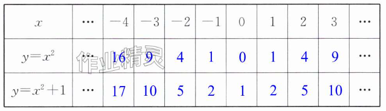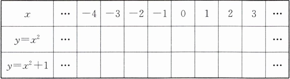 2. 观察表格,当$x$取相同数值时,二次函数$y = x^{2} + 1$与二次函数$y = x^{2}$的值有怎样的关系?它们的图像有怎样的位置关系?