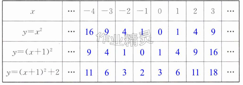 (2) 观察表格中的数值及函数表达式,说出它们的开口方向、对称轴和顶点坐标.