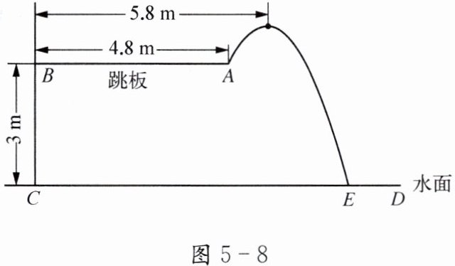 如图5-8,某跳水运动员在进行跳水训练时,身体(可看成一点)在空中的运动轨迹近似看成一条抛物线.已知跳板$AB$长为$4.8{m}$,跳板距离水面$CD$的高度$BC$为$3{m}$.训练时,运动员在离起跳点$A$的水平距离为$1{m}$处达到距离水面的最大高度$4{m}$.以$CD$为横轴,$CB$为纵轴建立平面直角坐标系.