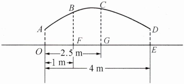 在跳大绳时,假设绳甩到最高处时的形状可近似看作抛物线形. 如图,正在甩绳的两人之间的距离 OE 为 4 m,手部到地面的距离 AO、DE 均为 1 m,跳绳的甲、乙两人与左侧甩绳人之间的距离 OF、OG 分别为 1 m、2.5 m,绳甩到最高处时,刚好通过他们的头顶. 已知甲的身高 BF 为 1.5 m,求乙的身高 CG.
