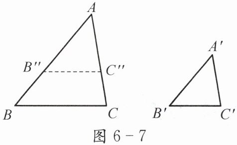 1. 如图6-7,在$\triangle ABC$和$\triangle A^{\prime}B^{\prime}C^{\prime}$中,$\angle A=\angle A^{\prime}$,$\frac{AB}{A^{\prime}B^{\prime}}=\frac{AC}{A^{\prime}C^{\prime}}$.试说明:$\triangle ABC \sim \triangle A^{\prime}B^{\prime}C^{\prime}$(提示:若$AB>A^{\prime}B^{\prime}$,在$AB$上截取$AB^{\prime\prime}=A^{\prime}B^{\prime}$,过点$B^{\prime\prime}$作$B^{\prime\prime}C^{\prime\prime} // BC$,交$AC$于点$C^{\prime\prime}$).