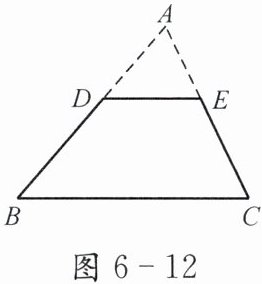 2. 马路旁边原有一个周长为 80 m 的三角形绿地 ABC(图 6 - 12),由于马路拓宽,绿地被“削”去一个角,变成了四边形绿地 BCED,其中 BC//DE,已知原绿地的一边 AB 的长由 30 m 缩短成 18 m,那么被“削”去部分的周长是多少?