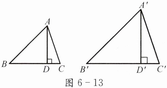 1. 如图 6 - 13,△ABC∽△A′B′C′,相似比为 k,AD 与 A′D′分别是△ABC 和△A′B′C′的边 BC、B′C′上的高. 试说明$\frac{AD}{A'D'}=k$.