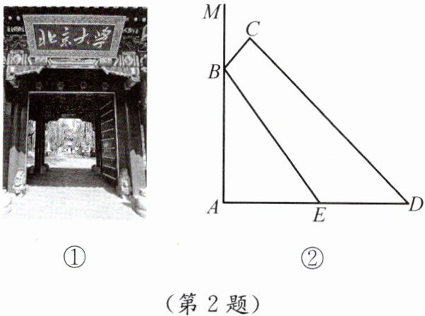 2.如图①,我国传统建筑的大门上常常悬挂着巨大的匾额.如图②,线段$BC$是悬挂在墙壁$AM$上的某块匾额.已知$BC = 1\ m$,$\angle MBC = 37^{\circ}$.从水平地面点$D$处看点$C$的仰角$\angle ADC = 45^{\circ}$,从点$E$处看点$B$的仰角$\angle AEB = 53^{\circ}$,且$DE = 2.4\ m$.(参考数据:$\sin 37^{\circ}\approx\frac{3}{5}$,$\cos 37^{\circ}\approx\frac{4}{5}$,$\tan 37^{\circ}\approx\frac{3}{4}$)