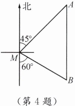 4.如图,一艘渔船位于小岛$M$的北偏东$45^{\circ}$方向、距离小岛$180\ n\ mile$的$A$处,渔船从$A$处沿正南方向航行一段距离后,到达位于小岛南偏东$60^{\circ}$方向的$B$处.