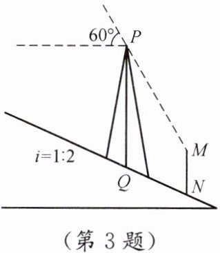 3.如图,信号塔$PQ$坐落在坡度$i$为$1:2$的山坡上,其正前方直立着一警示牌.当太阳光线与水平线成$60^{\circ}$角时,测得信号塔$PQ$落在斜坡上的影子$QN$长为$2\sqrt{5}\ m$,落在警示牌上的影子$MN$长为$3\ m$,求信号塔$PQ$的高.(结果保留根号)
