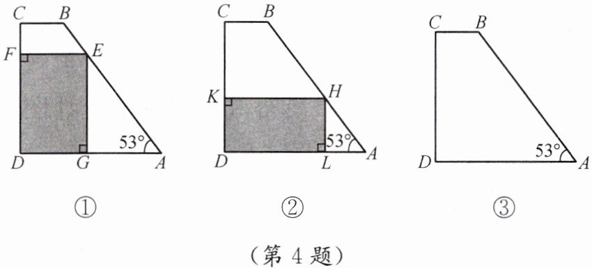 4.小林家门前有一块四边形的空地$ABCD$,其中$AD// BC$,$BC = 1.6\ m$,$AD = 5.5\ m$,$CD = 5.2\ m$,$\angle C = 90^{\circ}$,$\angle A = 53^{\circ}$.小林的爸爸想将一辆长$4.9\ m$、宽$1.9\ m$的汽车停放在这块空地上,让小林算算是否可行.小林设计了两种方案,如图①和图②所示.(参考数据:$\sin 53^{\circ}\approx 0.8$,$\cos 53^{\circ}\approx 0.6$,$\tan 53^{\circ}\approx\frac{4}{3}$)