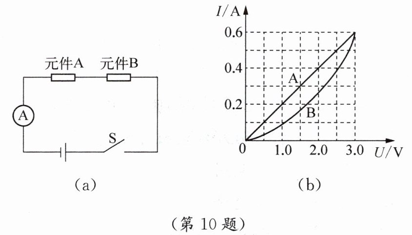 10. 将两个电路元件A、B串联在图(a)所示的电路中,通过元件的电流与其两端的电压关系如图(b)所示。闭合开关S,电流表的示数为$0.4 A$,则在相同时间内,两个电路元件A、B消耗的电功之比为(