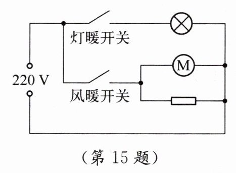 15. 某品牌多功能取暖器具有灯暖和风暖两种功能,其简化电路如图所示,部分参数见下表。当取暖器正常工作时,求: