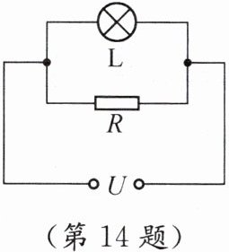 14. 如图所示,灯泡和电阻并联后接在电压为$U$的电路中,已知电阻的阻值为$R$,通过电路的总电流为$I$,则灯泡在$t$时间内消耗的电能是(