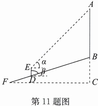 11. (15 分)(2025·陕西)小涵和小宇想测量公园山坡上一根信号杆的高度。在征得家长同意后,他们带着工具前往测量。测量示意图如图所示,他们在坡面 $ FB $ 上的点 $ D $ 处安装测角仪 $ DE $,测得信号杆顶端 $ A $ 的仰角 $ α $ 为 $ 45^{\circ} $,$ DE $ 与坡面的夹角 $ β $ 为 $ 72.5^{\circ} $,又测得点 $ D $ 与信号杆底端 $ B $ 之间的距离 $ DB $ 为 $ 22 \mathrm{ m} $。已知 $ DE = 1.7 \mathrm{ m} $,点 $ A $,$ B $,$ C $ 在同一条直线上,$ AB $,$ DE $ 均与水平线 $ FC $ 垂直。求信号杆的高 $ AB $。(参考数据:$ \sin 72.5^{\circ} \approx 0.95 $,$ \cos 72.5^{\circ} \approx 0.30 $,$ \tan 72.5^{\circ} \approx 3.17 $)