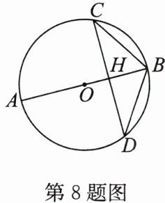 8. 如图,$ \odot O $ 的直径 $ AB $ 经过弦 $ CD $ 的中点 $ H $,若 $ \cos ∠ CDB = \dfrac{4}{5} $,$ BD = 5 $,则 $ \odot O $ 的半径为