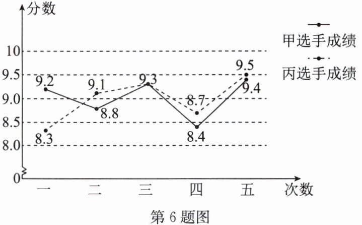 6. 在某中学运动会跳高比赛中,每位选手要进行五轮比赛,张老师对参加比赛的甲、乙、丙三位选手的得分(单位:分,满分10分)进行了数据的收集、整理和分析,信息如下: