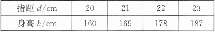 2. 大拇指与小拇指尽量张开时,两指尖的距离称为指距.人体构造学的研究成果表明,一般情况下人的身高h与指距d成函数关系.下表是测得的指距与身高的一组数据: