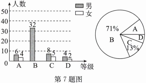 B等级的女生人数为$100× 71\% -32=39$,
