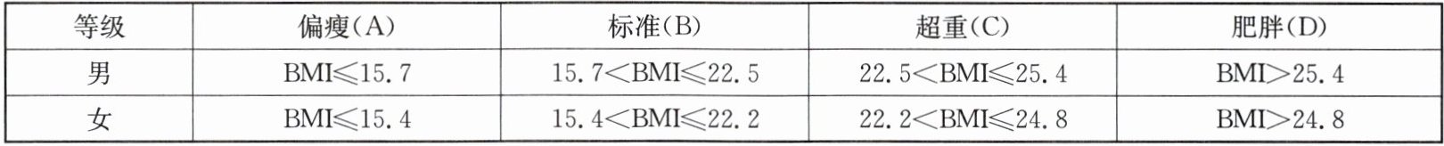 (1)若一位男生的身高为1.6 m,体重为51.2 kg,则他的体重指数(BMI)属于