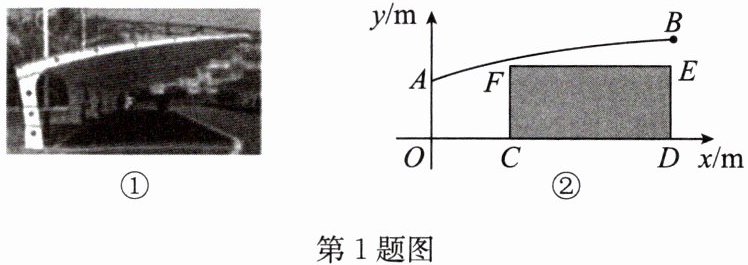 1. (2024·甘肃)如图①为一汽车停车棚,其棚顶的横截面可以看作是抛物线的一部分,如图②是棚顶的竖直高度 $ y $ (单位: $ \mathrm{m} $) 与距离停车棚支柱 $ AO $ 的水平距离 $ x $ (单位: $ \mathrm{m} $) 近似满足的函数关系 $ y = - 0.02 x ^ { 2 } + 0.3 x + 1.6 $ 的图像,点 $ B ( 6, 2.68 ) $ 在图像上. 若一辆厢式货车需在停车棚下避雨,货车截面看作长 $ C D = 4 \mathrm { m } $,高 $ D E = 1.8 \mathrm { m } $ 的矩形,则可判定该货车