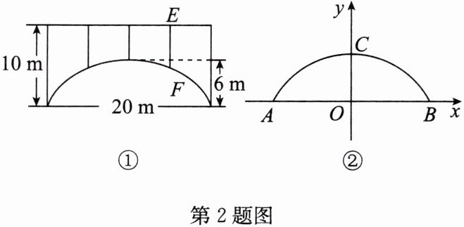 2. 如图①,一座拱桥的轮廓是抛物线形,拱高 $ 6 \mathrm { m } $,跨度 $ 20 \mathrm { m } $,相邻两支柱间的距离均为 $ 5 \mathrm { m } $.