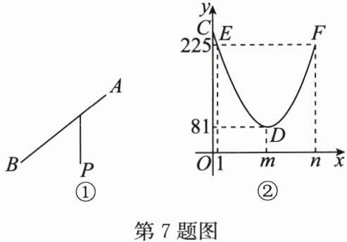 7. (2025·浙江)为了实时规划路径,卫星导航系统需要计算运动点与观测点之间距离的平方.如图①,$P$是一个固定观测点,运动点$Q$从$A$处出发,沿笔直公路$AB$向目的地$B$处运动.设$AQ$为$x$(单位:$km$)$(0 ≤ x ≤ n)$,$PQ^2$为$y$(单位:$km^2$).如图②,$y$关于$x$的函数图像与$y$轴交于点$C$,最低点$D(m,81)$,且经过$E(1,225)$和$F(n,225)$两点.下列选项正确的是(