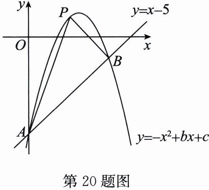 20. (15分)如图,$A$,$B$为一次函数$y = x - 5$的图像与二次函数$y = -x^2 + bx + c$的图像的公共点,点$A$,$B$的横坐标分别为$0$,$4$.$P$为二次函数$y = -x^2 + bx + c$的图像上的动点,且位于直线$AB$的上方,连接$PA$,$PB$.