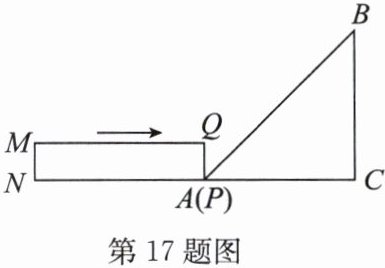 17. 如图,在 $ \mathrm{Rt} △ ABC $ 中,$ ∠ C = 90^{\circ} $,$ AC = BC = 8 \, \mathrm{cm} $,矩形 $ MNPQ $ 的长和宽分别为 $ 9 \, \mathrm{cm} $ 和 $ 2 \, \mathrm{cm} $,点 $ P $ 和点 $ A $ 重合,$ NP $ 和 $ AC $ 在同一条直线上,$ \mathrm{Rt} △ ABC $ 不动,矩形 $ MNPQ $ 沿射线 $ NP $ 以 $ 1 \, \mathrm{cm/s} $ 的速度向右移动,设移动 $ x(0 < x ≤ 9) \, \mathrm{s} $ 后,矩形 $ MNPQ $ 与 $ △ ABC $ 重叠部分的面积为 $ y \, \mathrm{cm}^{2} $,求 $ y $ 与 $ x $ 之间的函数表达式。