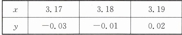 1. 在求解方程 $ a x ^ { 2 } + b x + c = 0 ( a ≠ 0 ) $ 时,先在平面直角坐标系中画出函数 $ y = a x ^ { 2 } + b x + c $ 的图像,观察图像与 $ x $ 轴的两个交点,这两个交点的横坐标可以看作方程的近似解。如图,分析图中的信息,可知方程的近似解是(