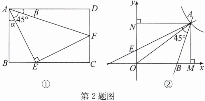 如图①,四边形$ABCD$是矩形,$△ AEF$是等腰直角三角形,记$∠ BAE$为$α$,$∠ FAD$为$β$,若$\tan α = \dfrac{1}{2}$,则$\tan β = \dfrac{1}{3}$.