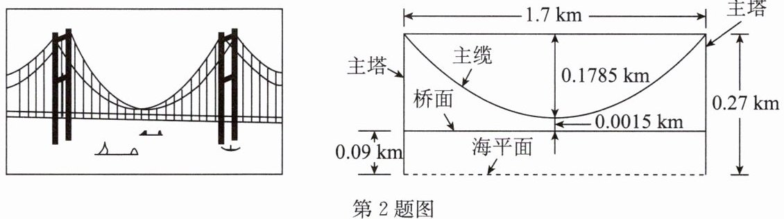 2. (2025·广东)如图,某跨海钢箱梁悬索桥的主跨长 $ 1.7 \mathrm{ km} $,主塔高 $ 0.27 \mathrm{ km} $,主缆可视为抛物线,主缆垂度 $ 0.1785 \mathrm{ km} $,主缆最低处距离桥面 $ 0.0015 \mathrm{ km} $,桥面距离海平面约 $ 0.09 \mathrm{ km} $. 请在示意图中建立合适的平面直角坐标系,并求该抛物线的函数表达式.