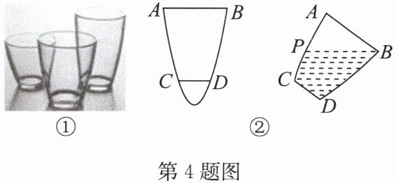 4. 一种玻璃水杯的截面如图①所示,其左右轮廓线 $ AC $,$ BD $ 为某一抛物线的一部分,杯口 $ AB = 8 \mathrm{ cm} $,杯底 $ CD = 4 \mathrm{ cm} $,且 $ AB // CD $,杯深 $ 12 \mathrm{ cm} $,如图②,若盛有部分水的水杯倾斜 $ 45^{\circ} $(即 $ ∠ ABP = 45^{\circ} $),水面正好经过点 $ B $,则此时点 $ P $ 到杯口 $ AB $ 的距离为