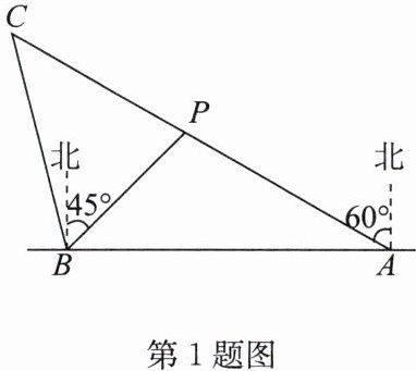 1. (2024·鼓楼区一模)如图,在一笔直的海岸线上有 A,B 两个观测站,A 在 B 的正东方向,$AB = 2$km. 有一艘小船在点 P 处,从 A 测得小船在北偏西$60^{\circ}$的方向,从 B 测得小船在北偏东$45^{\circ}$的方向.