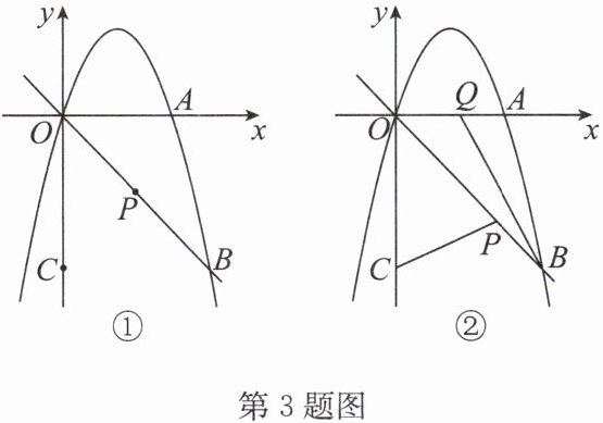 3. 如图①,抛物线$y=-x^{2}+bx$与$x$轴交于点$A$,与直线$y=-x$交于点$B(4,-4)$,点$C(0,-4)$在$y$轴上.点$P$从点$B$出发,沿线段$BO$方向匀速运动,运动到点$O$时停止.