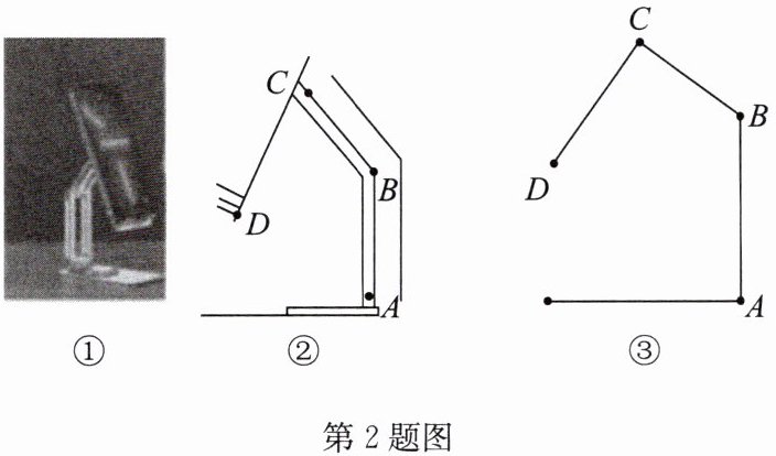 2. 如图①是一款多功能可调节的桌面手机、平板支架. 图②是其侧面示意图,点 A,B,C 处均可旋转$180^{\circ}$,CD 处可摆放平板或者手机. 其中$AB = 91$mm,$BC = 75$mm,$CD = 80$mm. 研究表明,当手机(CD)与桌面的夹角为$55^{\circ}$时,更符合人体工学设计,也是多数人操作手机最舒适的角度.