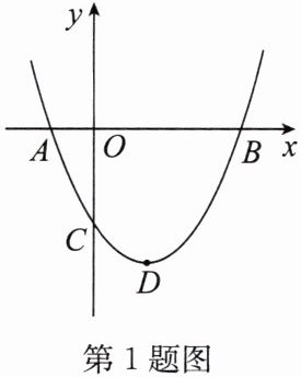 1. 如图,二次函数 $ y = ax^{2} + bx + c(a > 0) $ 图像的顶点为 $ D $,其图像与 $ y $ 轴交于点 $ C $,与 $ x $ 轴的交点 $ A $,$ B $ 的横坐标分别为 $ -1 $,$ 3 $。当 $ △ ACB $ 为等腰三角形时,满足条件的 $ a $ 的值有(