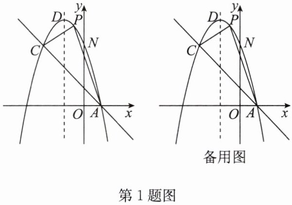 1. 如图,抛物线$y=-x^{2}+bx+c$与一直线相交于$A(1,0),C(-2,3)$两点,与$y$轴交于点$N$,其顶点为$D$.