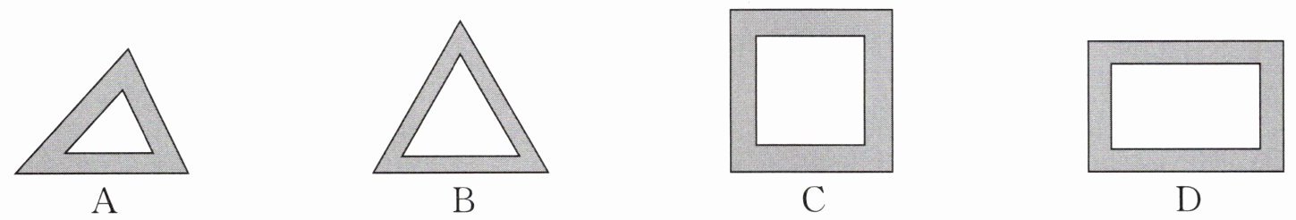 8. 手工制作课上,小红利用一些花布的边角料,剪裁后装饰手工画,下面四个图案是她剪裁出的空心不等边三角形、等边三角形、正方形、矩形花边,其中,每个图案花边的宽度都相等,那么,每个图案中花边的内外边缘所围成的几何图形不一定相似的是(
